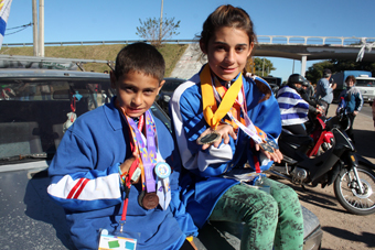 Lucila Ludueña (13) y Jackson Meléndrez (9), junto a su entrenador Fernando Launás, fueron recibidos el domingo por la mañana en el trébol de acceso a nuestra ciudad por el intendente Guillermo Caraballo, y desde allí recorrieron avenida Italia, República Argentina, 18 de Julio y Entre Ríos, para llegar a la Escuela 88, donde fueron homenajeados.