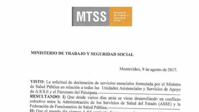El Ministerio de Trabajo y Seguridad Social, a solicitud del Ministerio de Salud Pública, resolvió esta noche declarar esenciales la totalidad de los servicios públicos y privados prestados por la Administración de los Servicios de Salud del estado (A.S.S.E), así como los prestados por el Patronato del Psicópata, los que deberán ser efectuados bajo el control, dirección y responsabilidad de A.S.S.E y del MSP. La resolución de esencialidad tiene vigencia a partir de hoy 9 de agosto.
