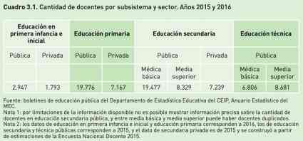 Dado que en Primaria los maestros deben ser necesariamente egresados del Instituto de Formación Docente, el problema es más marcado en la educación media, donde el déficit persiste, especialmente en los centros que dependen del Consejo de Educación Técnico Profesional (CETP-UTU). En este caso, casi siete de cada diez profesores de secundaria pública y seis de cada diez de secundaria privada son titulados. La educación técnica presenta una tasa menor de docentes titulados (41%).