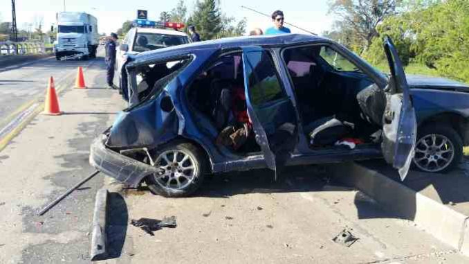 Un automóvil Peugeot que se dirigía al norte, fue chocado de atrás por un camión. El conductor del vehículo indicó que delante suyo transitaba un camión por lo que trató de evitar el impacto y maniobró hacia un costado, impactando al costado del puente.