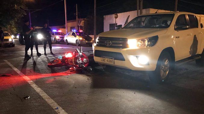 Producto del impacto, el uniformado cayó y habría quedado con la pierna aprisionada entre la motocicleta y la camioneta. Personal médico que concurrió a asistirlo indicó que podría tratarse de una fractura.