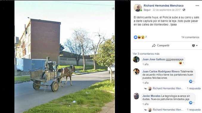 La imagen viral no corresponde al departamento de Durazno, ni al momento en que se publicó y la leyenda tampoco narra lo que estaba sucediendo. A través de una búsqueda de palabras clave -policía, carro, caballo- con la herramienta Who posted what?, Verificado identificó que esa misma foto apareció publicada en Facebook con mejor calidad que la del posteo viral en setiembre de 2017. Según informa el posteo, la imagen corresponde a un hecho ocurrido en el barrio de La Teja, departamento de Montevideo.