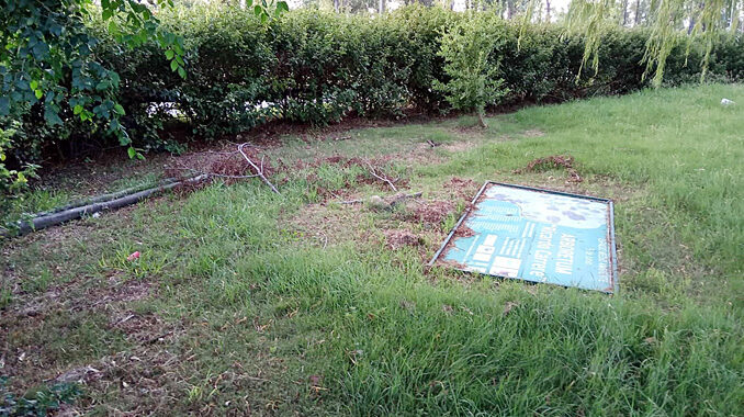 Con estos daños se encontraron el domingo “en una actividad que fuimos a hacer para limpiar, para restaurar, tareas de mantenimiento, y nos encontramos con este panorama. Habían volteado el cartel y se habían robado uno de los postes que soportaban el cartel. Son postes de madera curada, no sé cuál habrá sido el destino”.