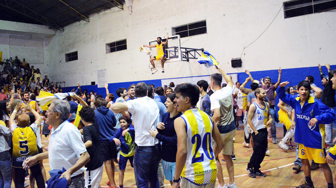 Jugadores, parciales, dirigentes, todos saltando, festejando el título de campeón de Honor del básquetbol de Primera División logrado por Centro Allavena tras definir a su favor por un tanto de diferencia, el quinto partido que definió la serie disputado en el gimnasio “Raúl Zannier” de Paysandú Wanderers.