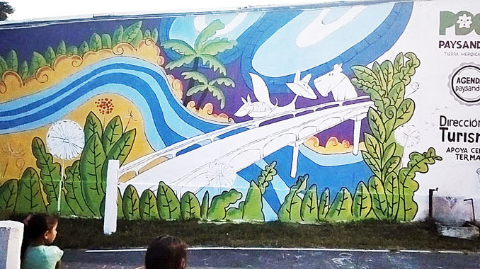 La iniciativa de pintar el mural que mide 10 metros por 4 fue del centro comercial de Termas de Guaviyú. Por supuesto, el diseño tenía que ser alusivo a los valores del centro turístico. Una de las comerciantes del lugar se contactó con el dibujante Moisés Bassadone quien propuso un par de diseños. El que se eligió fue uno que alude a la naturaleza que rodea al complejo termal y se destacan el arroyo Guaviyú, con el puente sobre ruta 3, las piscinas y un grupo de animales: un carpincho, una mulita y un zorro. Luego, para llevarlo a cabo, se coordinó entre el centro comercial y la intendencia proporcionarle al artista los materiales y el alojamiento para que se pudiera completar la obra.