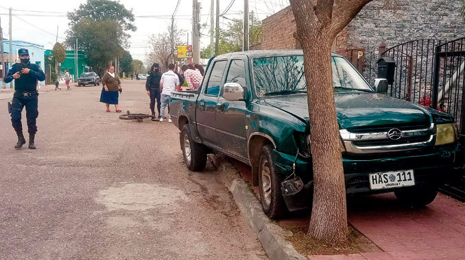 Ella dijo que transitaba por Carlos Albo y al doblar hacia Río Negro fue sorprendida por un ciclista que se cruzó delante, al que embistió. A raíz del choque, la mujer perdió el dominio de la camioneta y terminó sobre la vereda, impactando contra un árbol del ornato público.