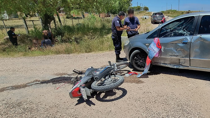 Pasado el mediodía de ayer un auto y una moto chocaron en las inmediaciones de la Escuela N° 45. Ambos vehículos circulaban por Brandao Sosa en la misma dirección, rumbo al Este. En determinado momento el auto Fiat Línea, matrícula IAD 6136, dobló en dirección al norte, por lo que entró en colisión con la moto Yumbo GS2, matrícula ICU 6136 que no pudo frenar a tiempo.