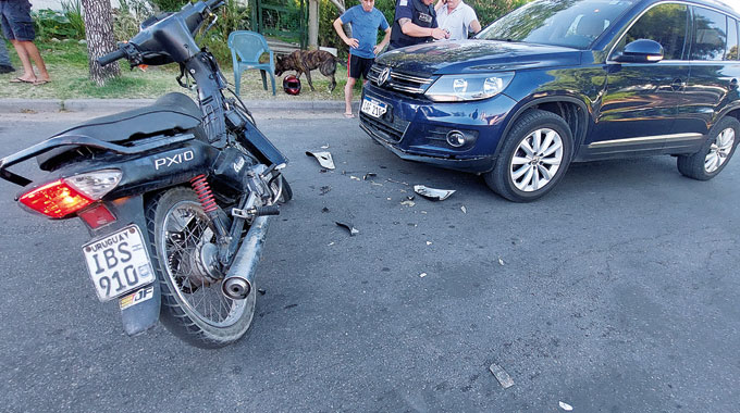 Minutos más tarde, un hombre que se trasladaba por calle Sarandí en la moto Yumbo matrícula ICT9283 chocó y cayó junto al auto Nissan IAD9414 que salía del estacionamiento a pocos metros de la esquina con Bulevar Artigas.