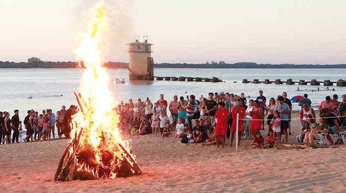 Luego Isgleas volvió a la arena, donde le pasó el balón al malabarista Diego Ayala quien, luego de hacer una demostración con la pelota, encendió unos mecheros y fue haciendo malabares hasta donde estaban tres integrantes de la Escuela de Arquería Tapurú-Suizo. Allí, Ayala encendió las punta de las flechas a cada uno de los arqueros, quienes lanzaron el tiro para prender la llama de la fogata que dio inicio a la temporada oficial de playas.
