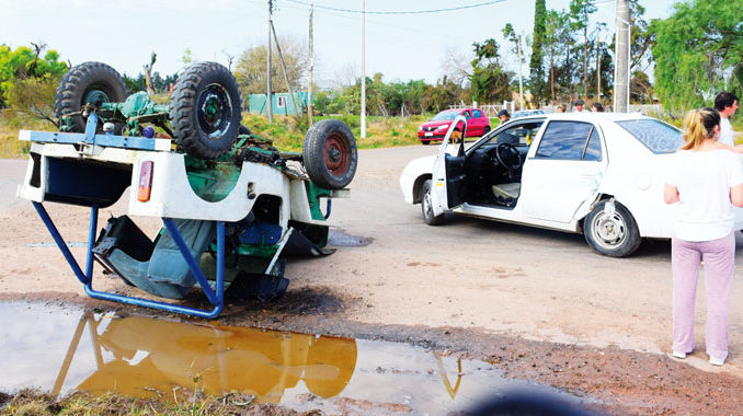 A raíz del impacto –a la altura de la puerta del acompañante del lado izquierdo del auto– el jeep, sin techo y de estructura liviana, volcó y quedó con las ruedas hacia arriba.