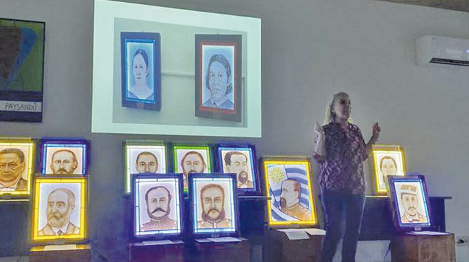 Por otra parte, a Gómez le gusta el material vidrio, particularmente el vitral, habiendo realizado cursos en Uruguay, Italia, Costa Rica y Argentina. En este sentido, le surgió la idea de representar en el vidrio a los protagonistas de la Defensa 1864-65, agregando a su conocimiento el curso de gestión cultural. “Quería tener mayor claridad sobre lo que me proponía y surge la idea de relacionar el arte del vitral con la historia”, explicó. “Como todo docente planifico, proyecto y me planteo la necesidad de un trabajo colaborativo con un profesor de historia”, por lo que invitó a su amiga, la profesora Amelia Varietti. “A ella le gustó la propuesta e inmediatamente se puso a trabajar; el cumplimiento al primer objetivo le correspondía pues debíase relevar los conceptos sobre historia local y regional, identidad, valores de la época, contextualizar los personajes del tercer Sitio a Paysandú, seleccionar algunos protagonistas y realizar una descripción de cada uno”, relató Gómez.