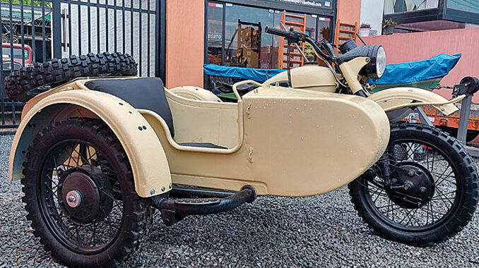 Una motocicleta marca Ural, de procedencia rusa con motor de 600 cc de cilindrada con el sidecar instalado fue captada por nuestro fotógrafo en oportunidad de visitar el taller de Fabio Frutos.