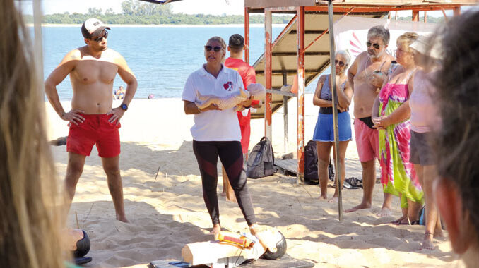 Tal como se había informado, en la víspera se llevó a cabo el primer taller –de una serie de dos– sobre técnicas de reanimación cardiopulmonar (RCP) y uso de desfibrilador externo automático (DEA) que fue impartido en el Balneario Municipal, Zona B. Fue dictado por Luján Méndez, instructora del sitio Cerca Paysandú de Salud Pública y funcionaria del Plan de la Costa de la Dirección de Turismo, a quien acompañaron guardavidas municipales.