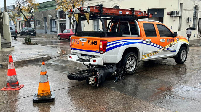 Al llegar al cruce con Sarandí la camioneta frenó, ocasión en que el birrodado embistió la parte trasera. A raíz del pavimento mojado, la motocicleta se desplazó y quedó parcialmente debajo de la camioneta.