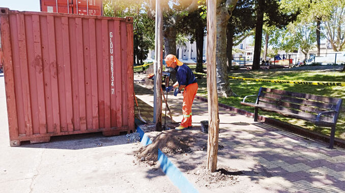 Por calle Florida se comenzó con la colocación de postes de madera, trabajo que se realizará en toda la plaza, para posteriormente comenzar con el cerramiento propiamente dicho con chapas, y -donde corresponda- portones para permitir el ingreso y salida de materiales y maquinaria pesada.