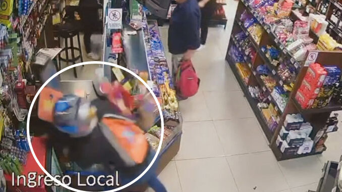 En base a los registros fílmicos a los que accedió EL TELEGRAFO, el malviviente arribó al local como acompañante en una motocicleta negra, carente de chapa matrícula. Tenía un casco integral blanco con visera oscura y una mochila chica en su espalda. La moto es vista aparecer por Setembrino Pereda desde el sur, conducida por un hombre con casco claro. Al llegar a la esquina de avenida Salto, la motocicleta frenó y el acompañante se bajó. Al notar que había otra persona ingresando al comercio, hicieron una maniobra a modo de despiste, mientras el chofer dio la vuelta unos metros quedando por fuera de la cámara frontal. El acompañante, en tanto, ingresó al local llevando guantes y el rostro cubierto por el casco y se detuvo junto al mostrador de la caja, en los escalones de entrada, tal vez para simular que compraría algo de ese sector.