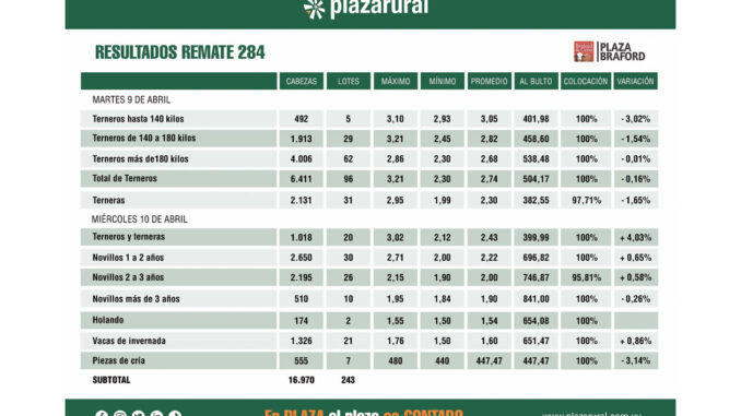 Fue una clara demostración de la gran demanda existente en la actualidad, sin excepciones de categorías, merced a la muy buena disposición de pasturas en los campos del país, y también al interesante estado del ganado que se ofrece, con más kilos que la venta anterior del consorcio. El de ayer fue el segundo de los tres días de la edición 284 de Plaza Rural, desde el hotel Cottage de Montevideo, y con el Banco de la República, tras la excelente venta de terneros el primer día, en donde se colocaron 6.411 terneros machos, el 100% de los ofertados, a U$S 504 al bulto y 2.131 terneras, el 97,71%, a U$S 382 de promedio.
