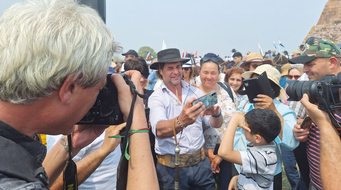 Al bajarse del caballo y luego de atender las decenas de pedidos de selfies, el presidente Lacalle Pou –vestido a lo paisano, facón incluido, sudado y con una botella de agua en la mano– se sumó a ese grupo y se colocó al lado de Olivera. Rieron, posaron, y aplaudieron el resto del desfile gaucho.
