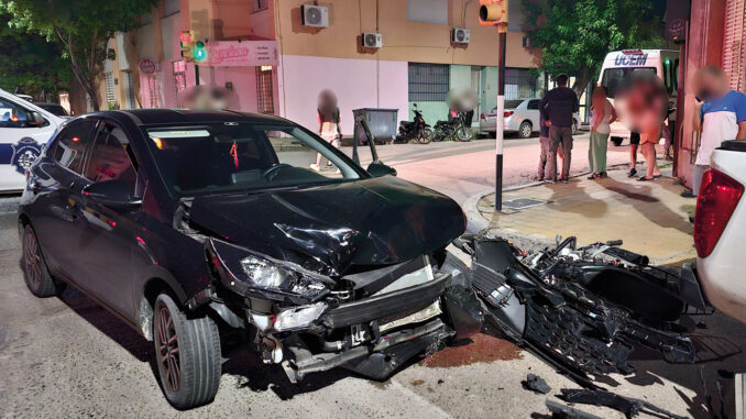 Una joven que viajaba como acompañante en una moto que guiaba un menor de edad resultó lesionada tras chocar con un automóvil, anoche en la intersección de calles Florida y Dr. Luis Batlle Berres.