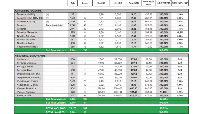Plaza Rural concretó en la víspera el segundo remate del mes de noviembre, colocando 15.186 vacunos (98,82%) y con suba de valores en todas las categorías. El ingeniero agrónomo Fernando Indarte Gianoni lo definió como “un remate extraordinario”.