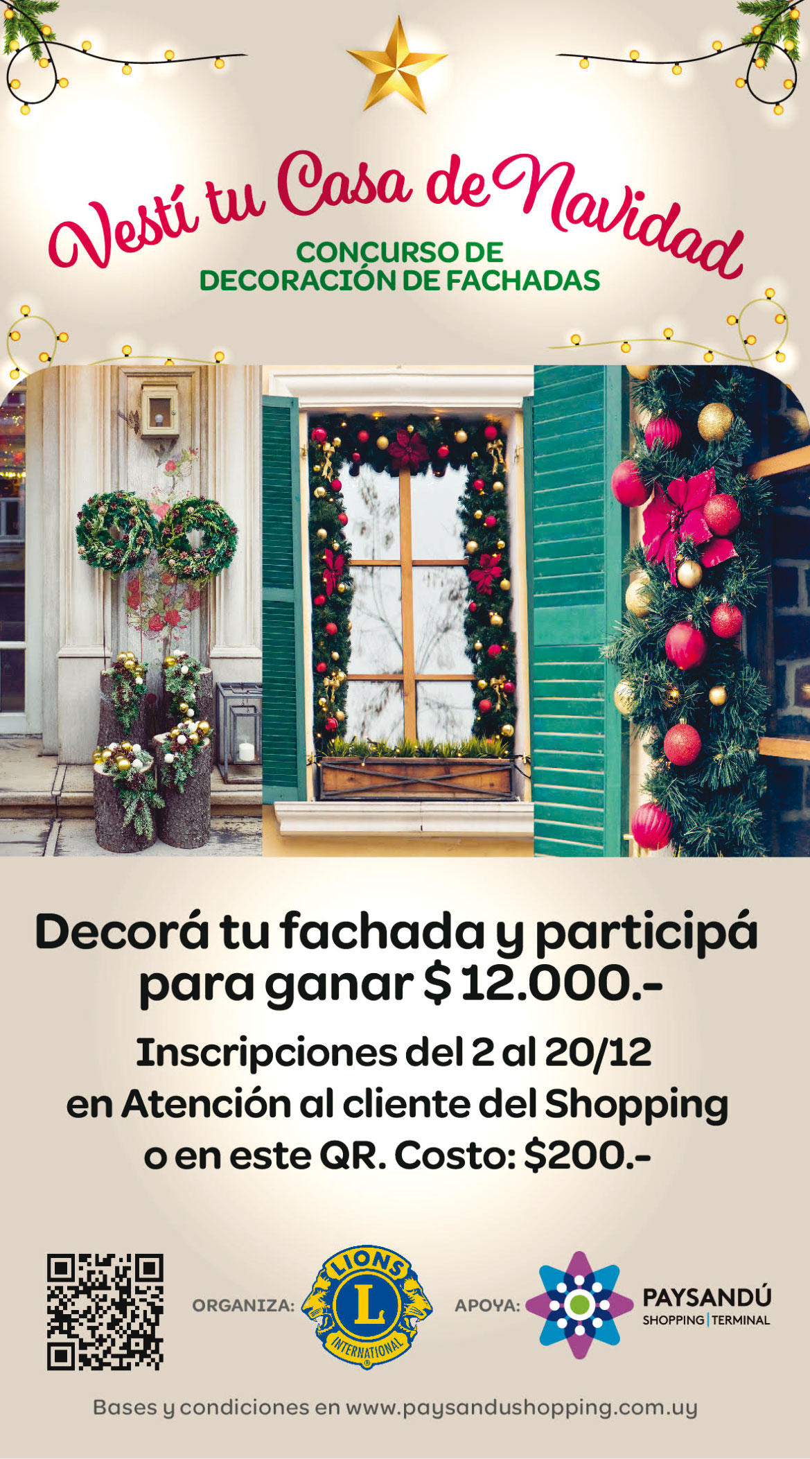 El Club de Leones, con el apoyo del Paysandú Shopping Terminal, lleva adelante el primer concurso de decoración de fachadas “Vestí tu casa de Navidad”, mediante el cual se podrá participar por un premio de $12.000 y, a la vez, colaborar con las obras que lleva adelante esta institución en nuestra comunidad.