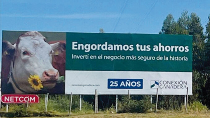 Por cada U$S 1 de ingreso la empresa debía pagar U$S 4 a sus inversores. Según el contador, el negocio terminó en una “timba” ya que en años complicados por precios o clima, la empresa perdió 20% o 30%, unos U$S 50 millones anuales, mientras que pagaba unos U$S 40 millones de intereses por año. El grupo de Conexión Ganadera, que incluye campos y frigorífico, tenía activos en ganado por U$S 100 millones, y otros U$S 58 millones en créditos a frigoríficos y campos, lo que totaliza U$S 158 millones. En tanto, su pasivo es de U$S 388 millones, con un capital de inversores de U$S 384 millones. Eso determina un déficit patrimonial de U$S 230 millones.