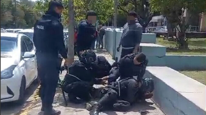Debido al porte del individuo y a la violencia que ejercía, los agentes debieron emplear un arma larga con munición no letal –de estruendo–, logrando así que desistiera de su actitud y fuera finalmente reducido en el suelo.