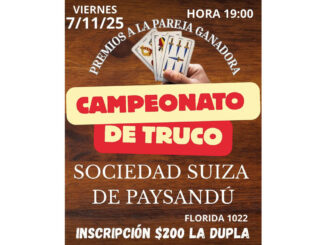 La Sociedad Suiza de Paysandú organizó para este viernes 7 una jornada de campeonato de truco con premios para la pareja ganadora. Es abierto a socios y público en general, y la inscripción tiene un valor de $ 200 por pareja. La cita es en su sede ubicada en Florida 1022. Desde la organización invitan a los interesados a participar en este encuentro lúdico, y disfrutar de un tiempo de camaradería.