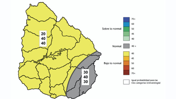 En esta primera región, el litoral, se esperan temperaturas por encima de lo normal, con una probabilidad de 45% en el tercil superior, un 35% al tercil medio, y un 20% al inferior. En cambio, en la segunda región, que comprende el resto del territorio, se esperan temperaturas medias entre normal y por encima de lo normal, asignándole un 40% de probabilidad a los terciles superior y medio, y un 20% a la categoría inferior.