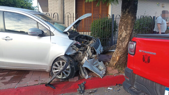 Como consecuencia del choque, el automóvil se desvió de su trayectoria e impactó contra un árbol de la vereda, presentando importantes daños en todo su frente.