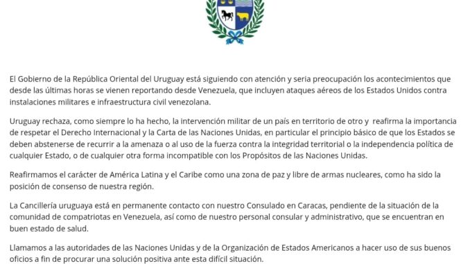 Ante la actual situación de tensión en Venezuela luego del ataque de Estados Unidos y la captura de Nicolás Maduro y su esposa, el gobierno uruguayo emitió un comunicado donde afirma estar siguiendo con atención y con seria preocupación los acontecimientos en Venezuela que desde las últimas horas se vienen reportando desde ese país, que incluyen ataques aéreos de los Estados Unidos contra instalaciones militares e infraestructura civil.