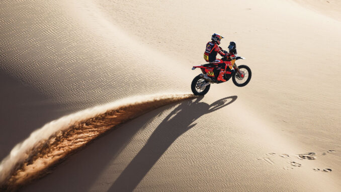 Luego del día de descanso, el Rally Dakar retomó su marcha, con la celebración de la séptima etapa entre Riad y Wadi ad-Dawasir, Arabia Saudita, con un recorrido total de 876 kilómetros. Fue un buen día para los sudamericanos, y sobre todo para los argentinos, que celebraron en diferentes catgorías. En motos, Luciano Benavides fue el ganador de la etapa, consiguiendo así su segunda victoria en esta edición. El argentino superó por casi cinco minutos al español Edgar Canet y al francés Adrien van Beveren. El australiano Daniel Sanders terminó cuarto y sigue mandando en la General, ahora con mayor distancia sobre el estadounidense Ricky Brabec, que sigue segundo a pesar del décimo puesto en la etapa; tercero aparece Benavides, cabeza a cabeza con Brabec.