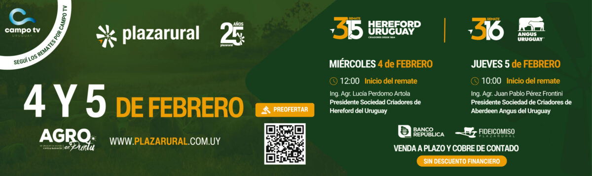 Este miércoles 4 y jueves 5 de febrero, Plaza Rural vuelve a ofrecer una gran oferta en volumen y calidad con las mejores condiciones de compra del mercado y la financiación de Banco de la República, oportunidad en la que Indarte y Cía. participa con una muy destacada consignación.