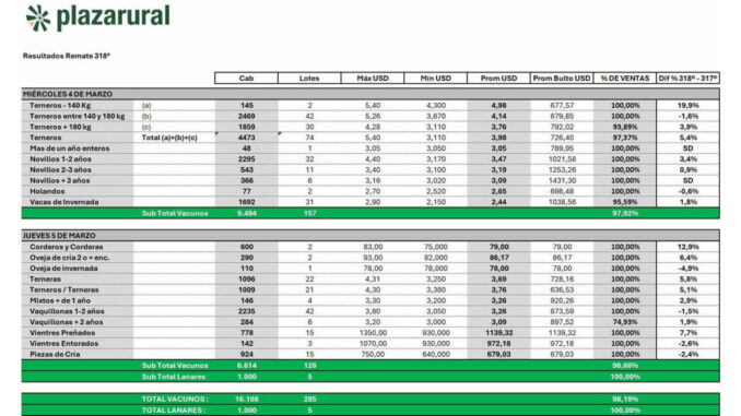 Plazarural concretó en dos días de ventas su remate 318, con valores récord en varias categorías –especialmente en los terneros– y una muy firme demanda. “Se pasaron por encima todos los precios de referencia que había hasta el momento en la categoría terneros”, manifestó a EL TELEGRAFO el ingeniero agrónomo Fernando Indarte Gianoni.