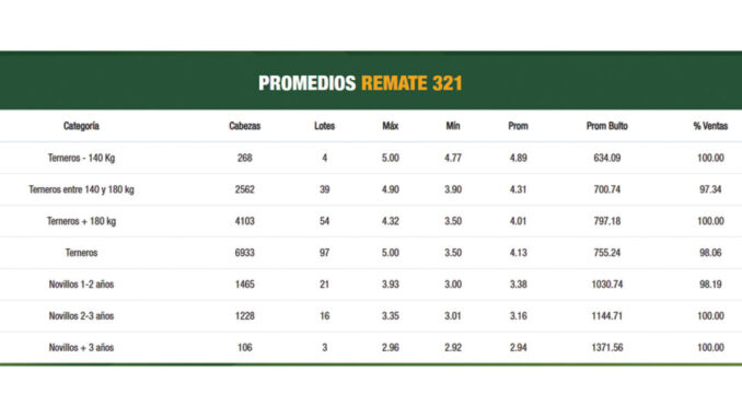 Fueron 6.933 los terneros vendidos, con un promedio de U$S 4,13 (755 dólares al bulto), dejando en evidencia que la zafra de esta categoría de la reposición se mantiene a gran ritmo, y con valores muy buenos para el momento. Mercado que se mantiene con los novillos livianos, colocándose 1.465 ejemplares de 1 a 2 en U$S 3,38 de promedio, y los más de 1.200 novillos de 2 a 3 años en U$S 3,16, U$S 1.144 al bulto.