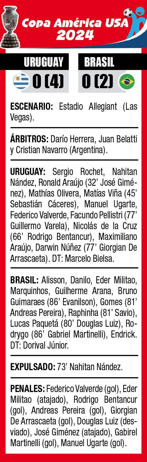 Desde los doce pasos, Valverde, Bentancur y De Arrascaeta convirtieron los tres primeros para dejar sin márgen de error a Brasil; “San Rochet” le había atajado a Militao y Douglas Luiz desvió su remate. En el quinto penal, Ugarte no perdonó y selló el boleto para Charlotte, donde la Celeste se las verá ante Colombia.